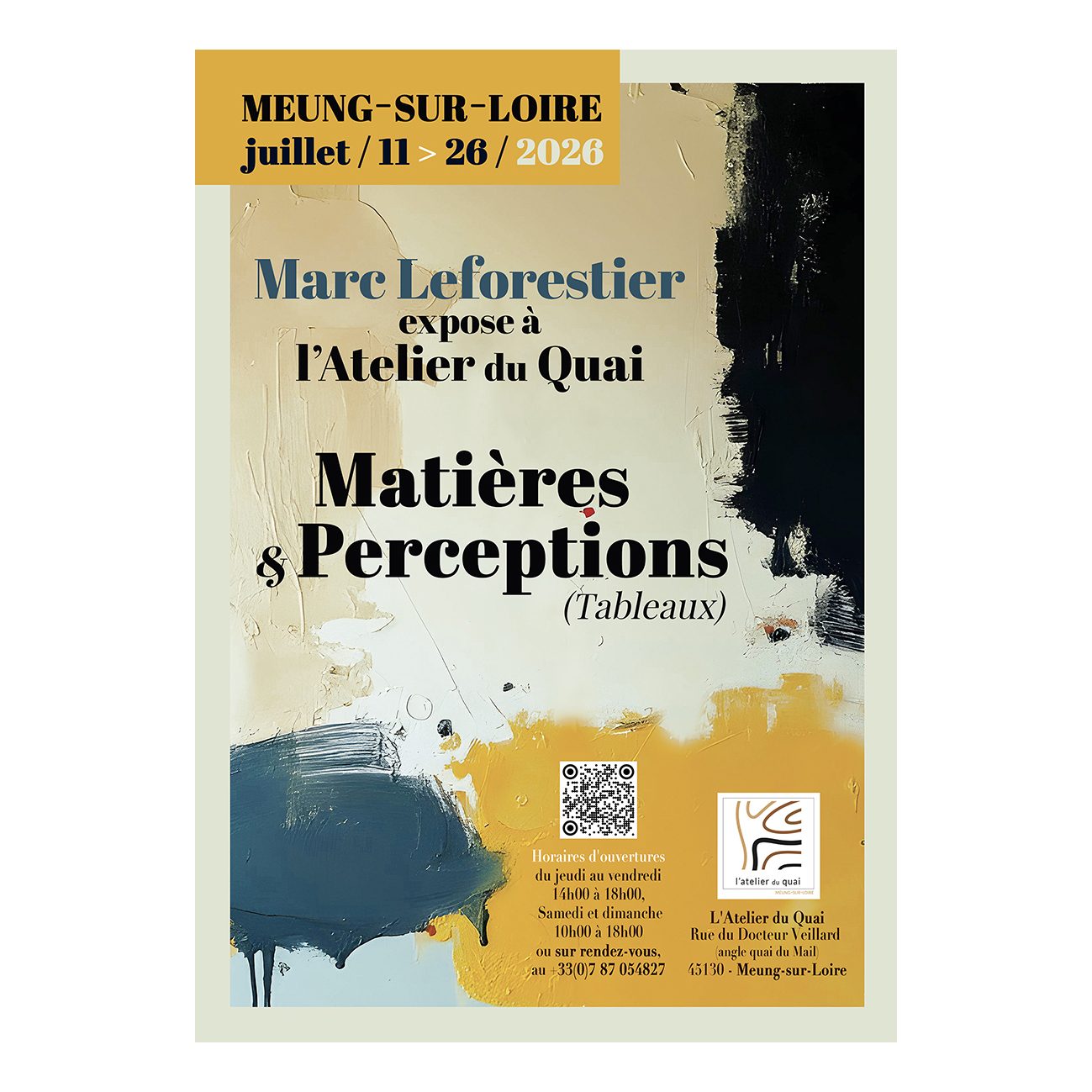 "Marc Leforestier, qui nous plonge dans l’abstraction. L’artiste aime à multiplier les expériences et les alliances de matières pour atteindre la substance même du Beau. Liants, plâtres, encres de chine, peintures acryliques et aquarelles, pastels, fusain, crayon, pigments naturels, vernis, cires et collages, rien n’arrête l’artiste alchimiste qui, loin de l’asphyxie, maîtrise cette exubérance grâce à un habile jeu de la couleur qui crée un contraste entre transparence et opacité, offrant pureté et légèreté. Parfois, on peut apercevoir une silhouette, comme pour nous entrainer dans ce monde qui laisse place à l’imagination, au lâcher prise." Cécile Facon - Pôle culturel de Meung-sur-Loire